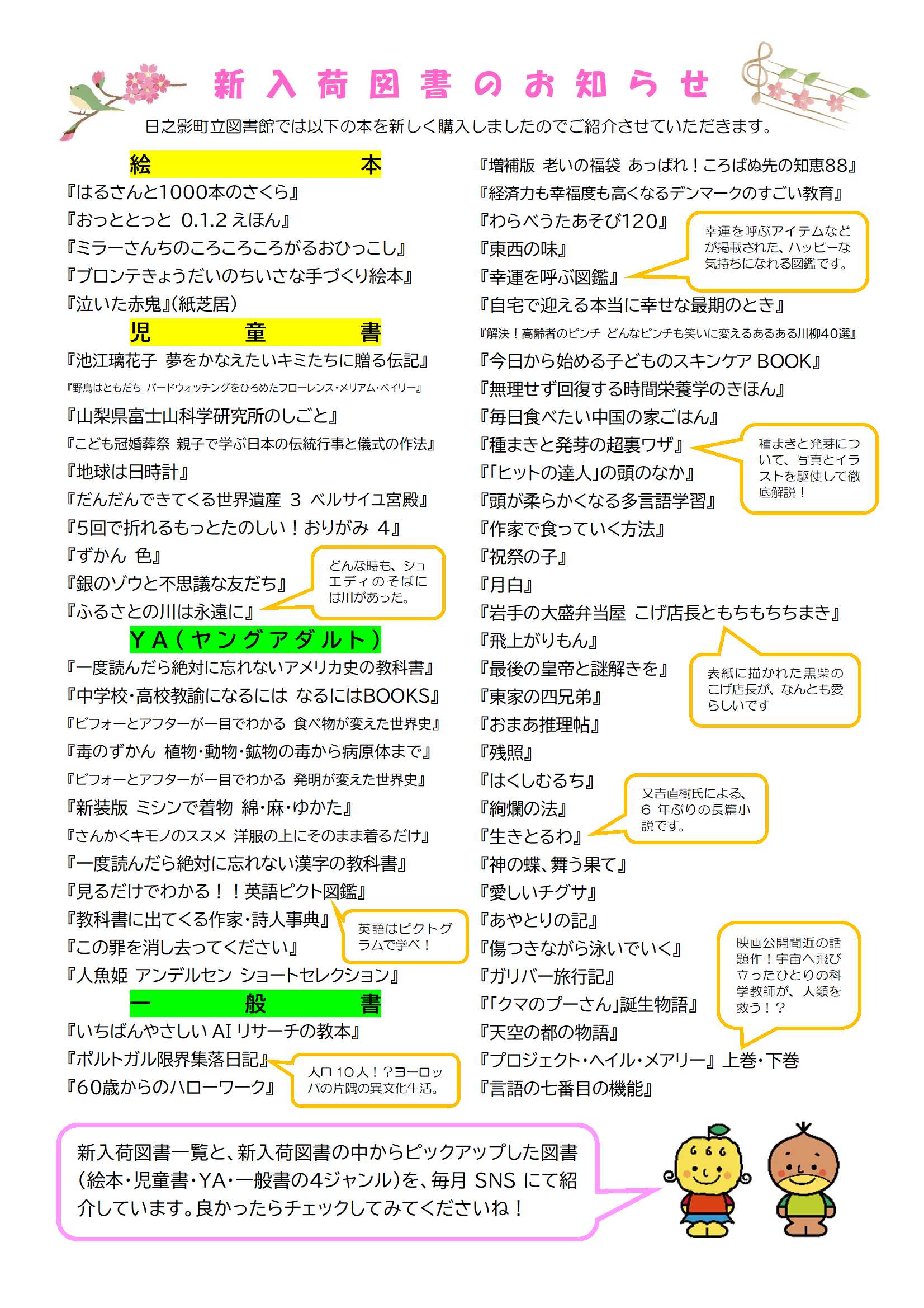新着図書情報など、図書館からのお知らせをお伝えします。