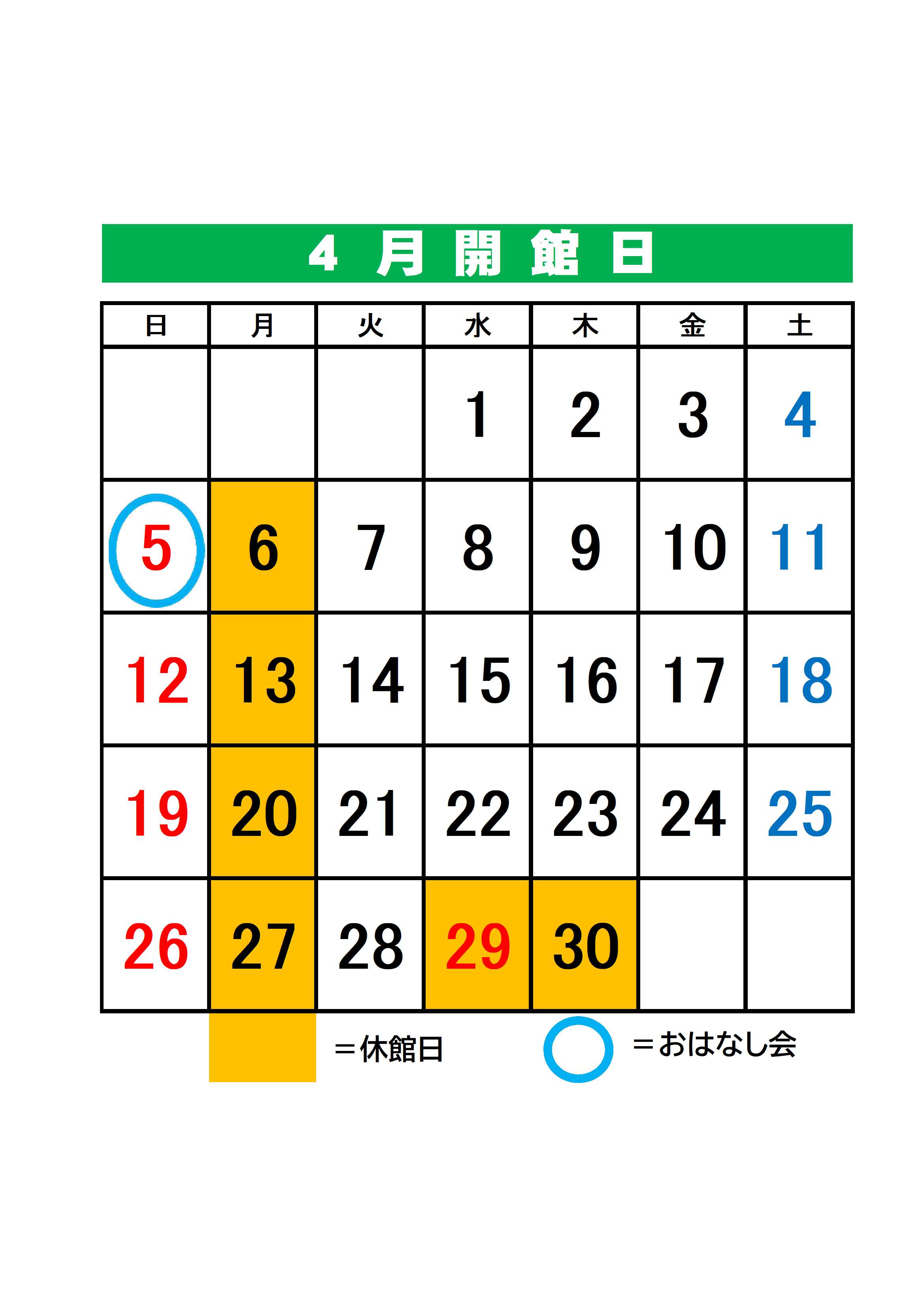 4月の休館日は、6日(月)、13日(月)、20日(月)、27日(月)、29日(水)、30日(木)