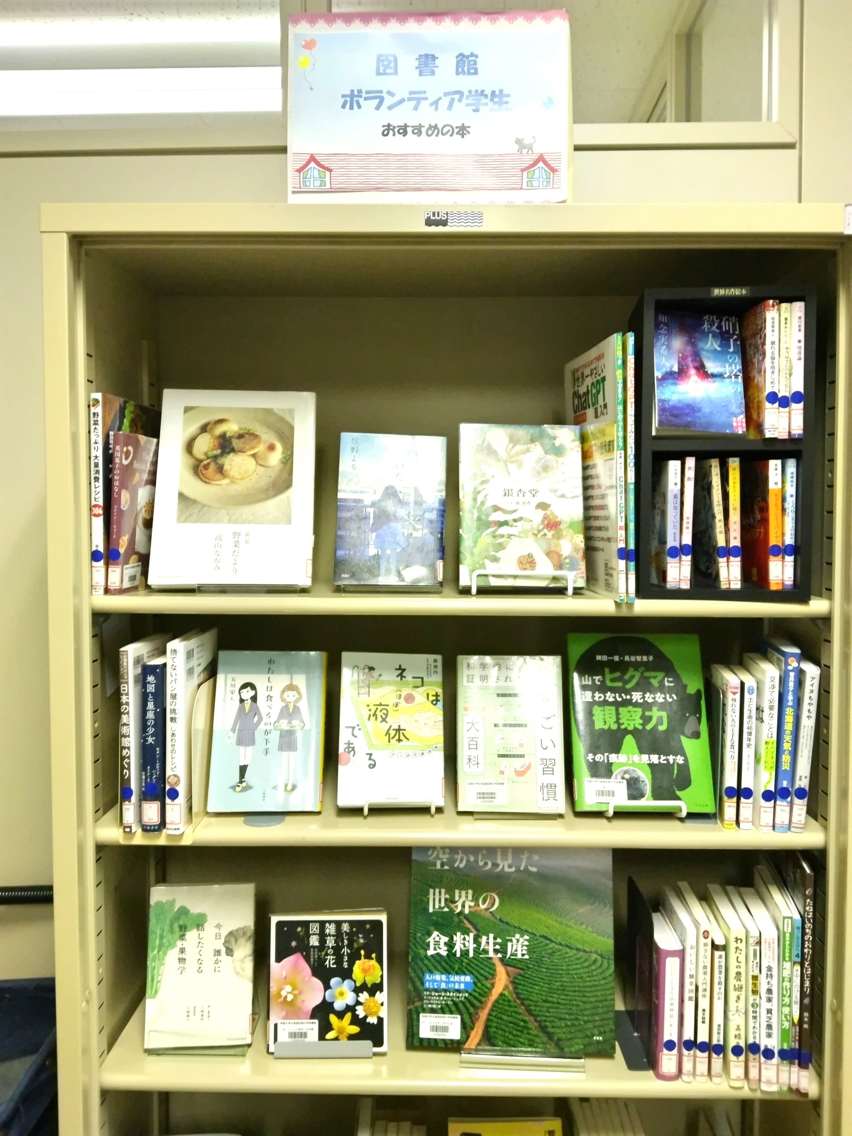 図書館では現在、図書館ボランティア学生がおすすめする本を展示しています。