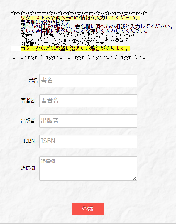 書名欄に調べもの相談と入力し、通信欄にわかる範囲で内容を入力してください。