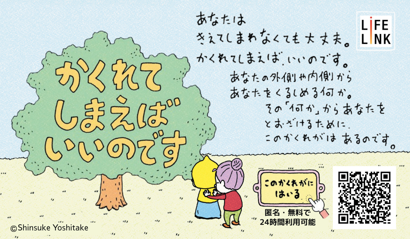 「プロジェクト『かくれてしまえばいいのです』(運営:NPO法人 自殺対策支援センター ライフリンク)は、生きるのがしんどいと感じている子ども・若者たちが、匿名・無料で24時間いつでも利用することができるオンライン広場です。ヨシタケシンスケは、コンセプト策定や全体の世界観・コンテンツ制作などに携わっております。」
