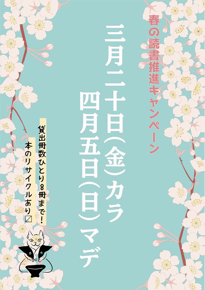 以下の通り、今春も①貸出2倍キャンペーン、②本のリサイクルを実施いたします。