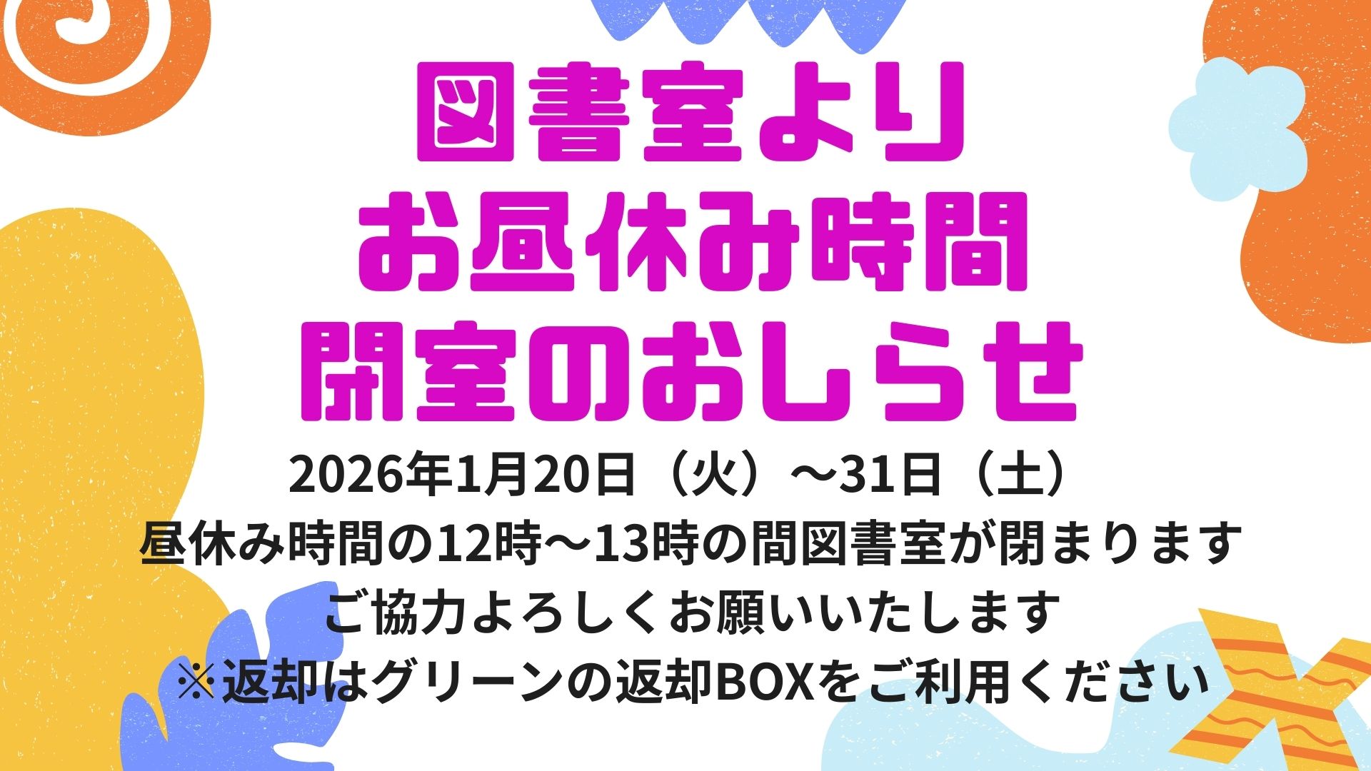 1/20(火)~31(土) お昼休み時間閉室のお知らせ