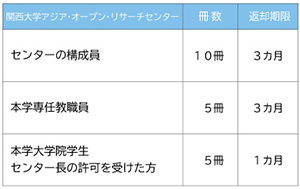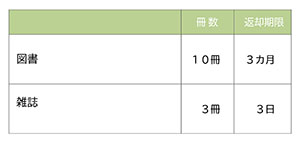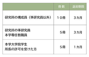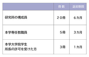 貸出冊数については、各研究所により規程が異なりますのでご注意ください。