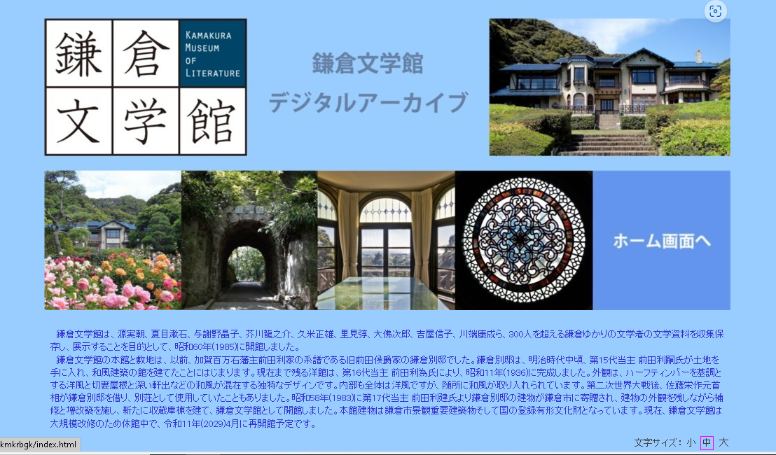 鎌倉文学館は、源実朝、夏目漱石、与謝野晶子、川端康成等の300人以上の鎌倉ゆかりの文学者の文学資料を収集・保存・展示しています。「鎌倉文学館デジタルアーカイブ」では、著作権保護期間が満了した同館収蔵資料について、資料画像と解説を検索・閲覧することができます。開設当初の第一弾として、夏目漱石と芥川龍之介が公開されています。