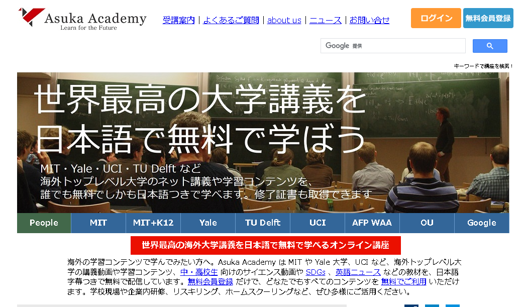 MITやYale大学、UCIなどをはじめとした海外トップレベル大学の講義や学習コンテンツ、中・高校生向けのサイエンス動画やSDGs教材を活用して学べます。