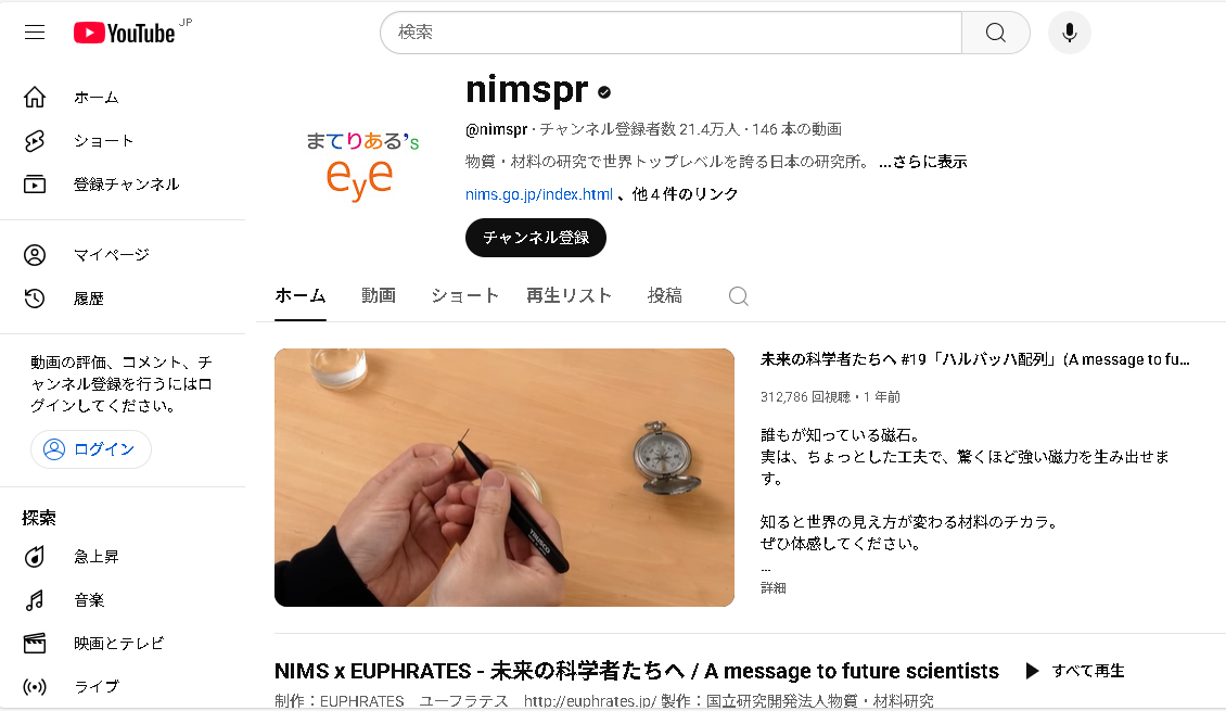 国立研究開発法人物質・材料研究機構(NIMS)が提供しています。このチャンネルは、NIMSが総力を挙げ、物質・材料の世界にワクワクしてもらえる映像があります。