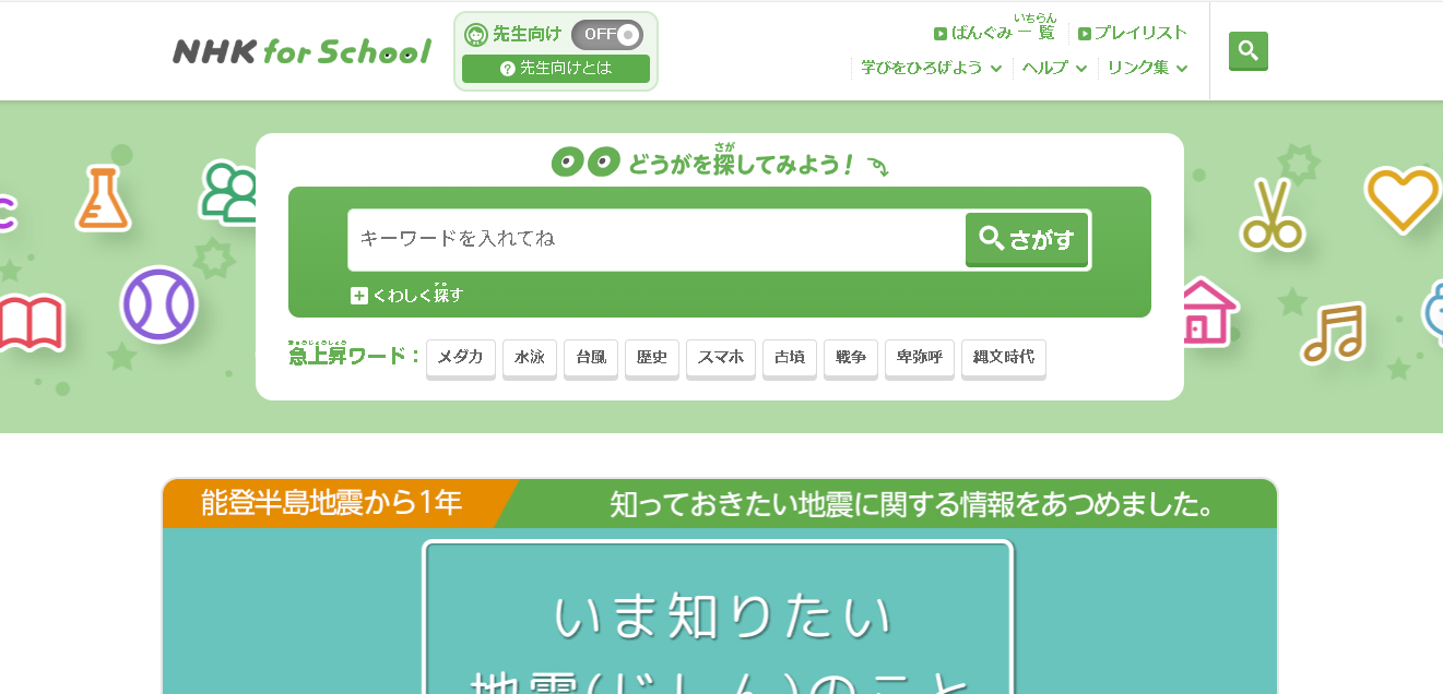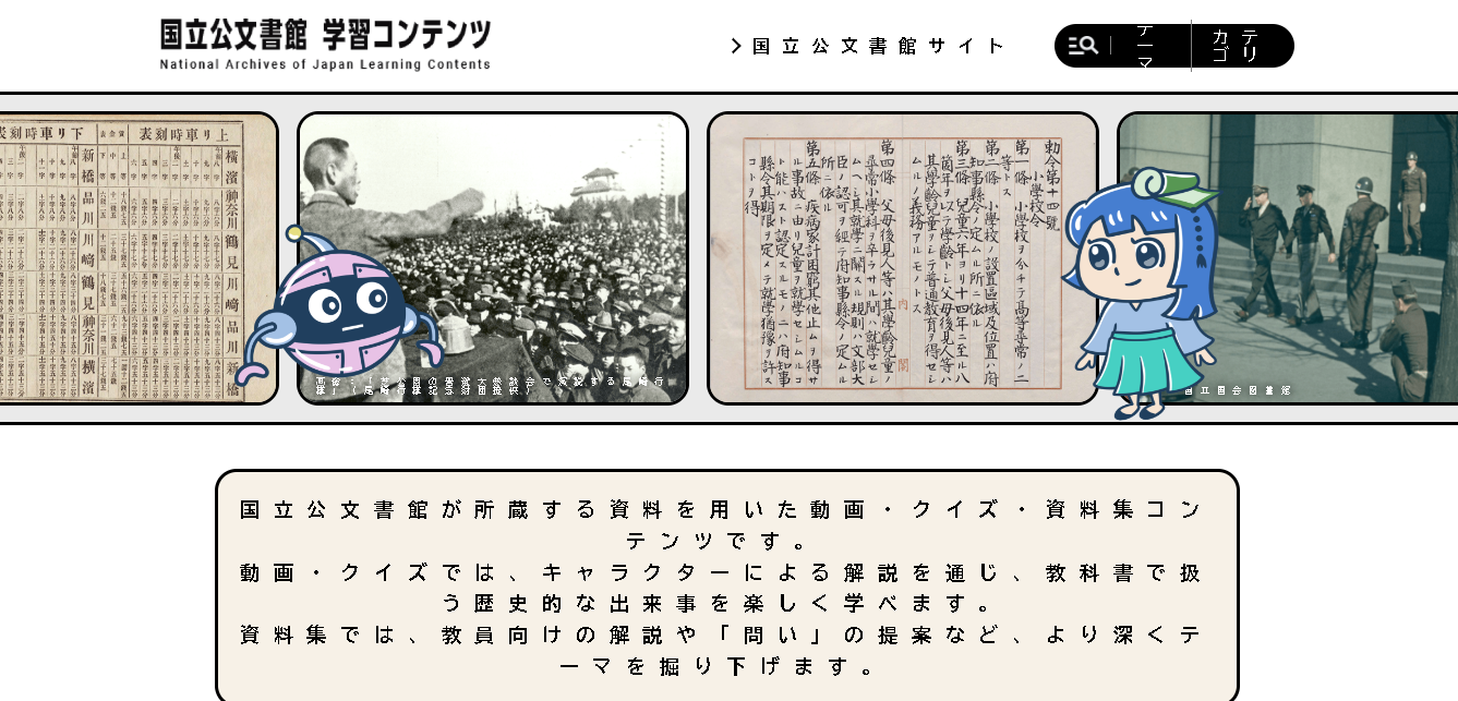 国立公文書館が所蔵する資料を用いた動画・クイズ・資料集コンテンツです。動画・クイズでは、キャラクターによる解説を通じ、教科書で扱う歴史的な出来事を楽しく学べます。資料集では、教員向けの解説や「問い」の提案など、より深くテーマを掘り下げます。