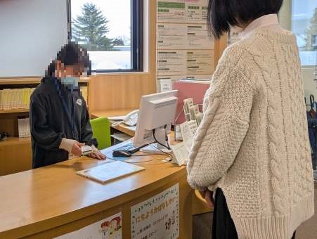 カウンター業務では、本の返却と貸出、返却本を棚にもどす作業をしました。バーコードスキャナーを使いこなし、パソコンの作業もスムーズに対応していました。返却後はしっかりラベルを確認し、もとの棚へ本をもどしました。