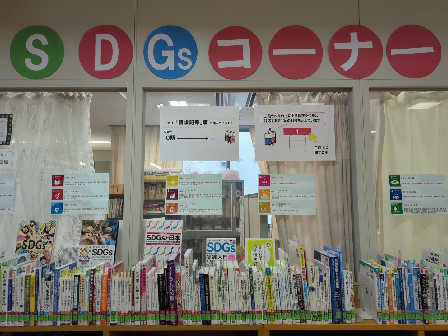 ②本の背に17のゴール(目標)の番号を貼りました。例:「気候変動」なら”13”です。