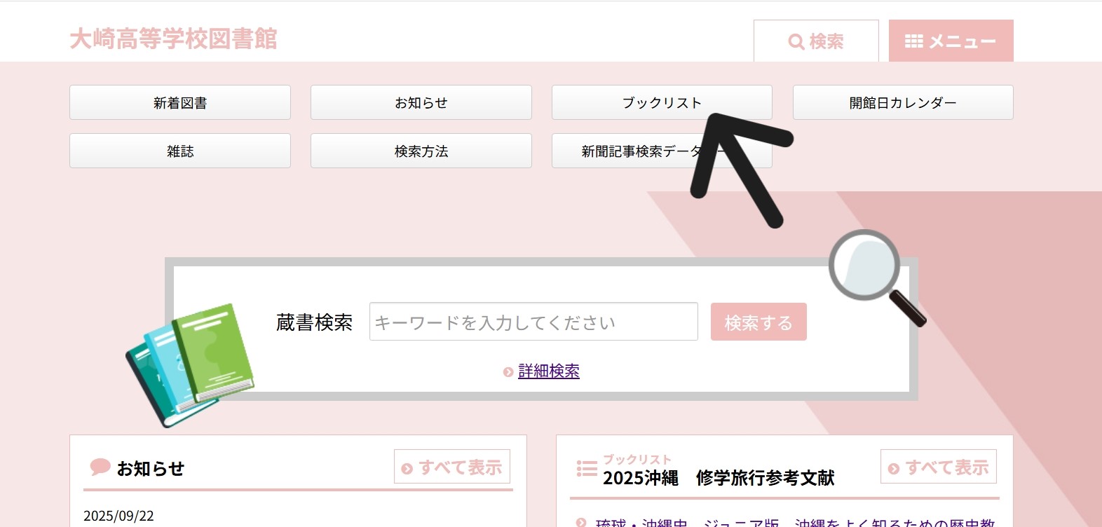 図書館HPトップの「メニュー」から「ブックリスト」を選び、スクロールすると領域ごとの