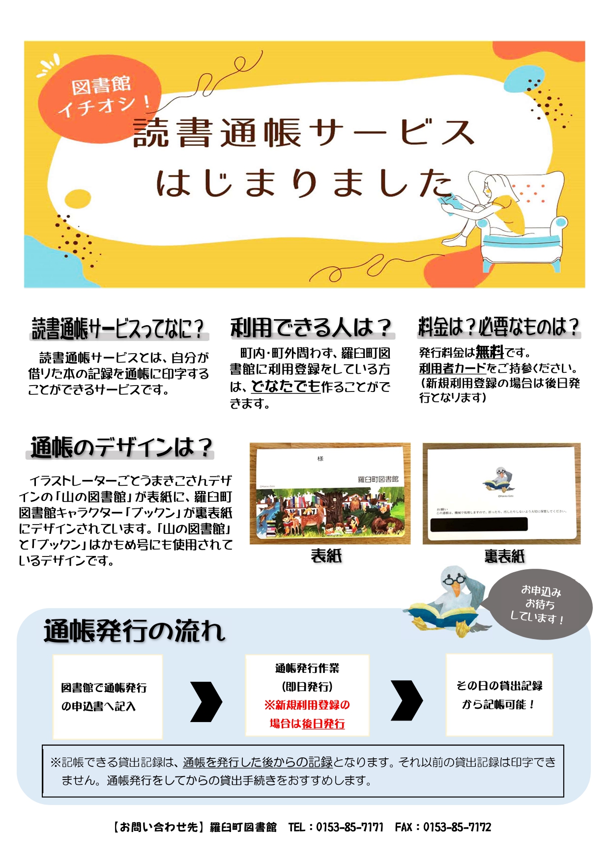 通帳は、イラストレーターのごとうまきこさんデザインの「山の図書館」が表紙に、羅臼町図書館キャラクター「ブックン」が裏表紙にデザインされています。