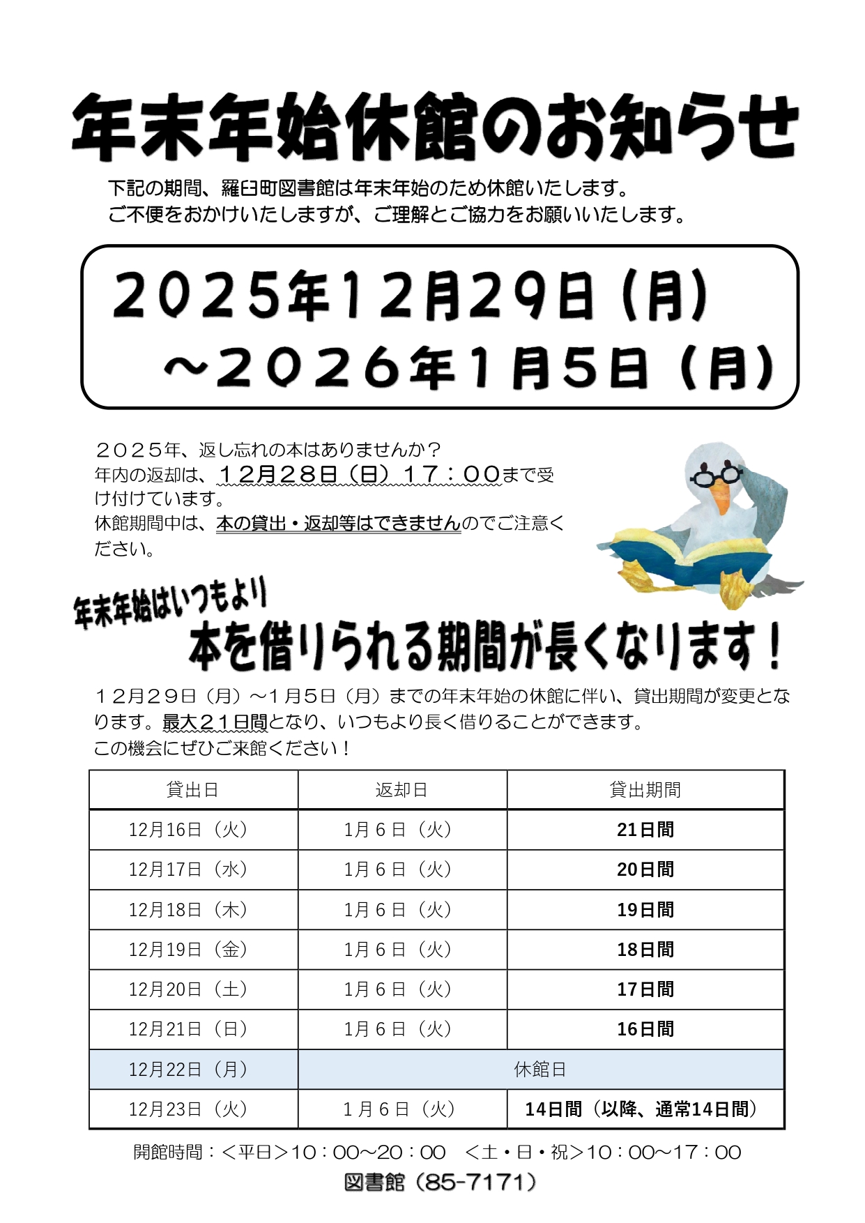休館期間は、2025年12月29日(月)~2026年1月5日(月)です。