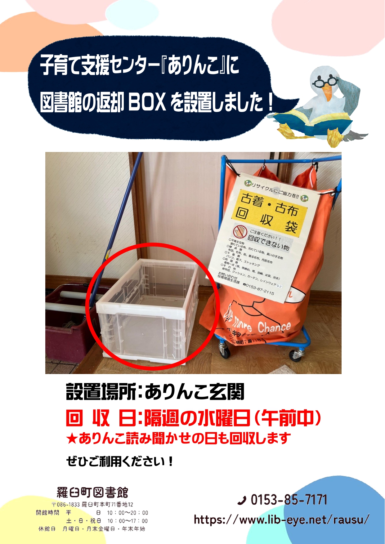 子育て中のご家庭の読書活動のサポートとして、子育て支援センター『ありんこ』に返却BOXを設置しました。