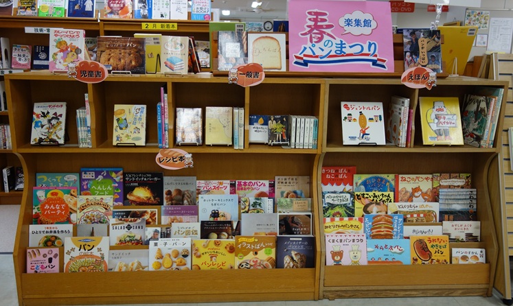 今月は、パンのレシピ本や、パンが登場する絵本や小説を集めました。「楽集館