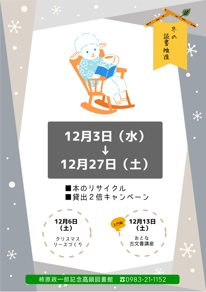 以下の通り、今冬も①貸出2倍キャンペーン、②本のリサイクルを実施いたします。