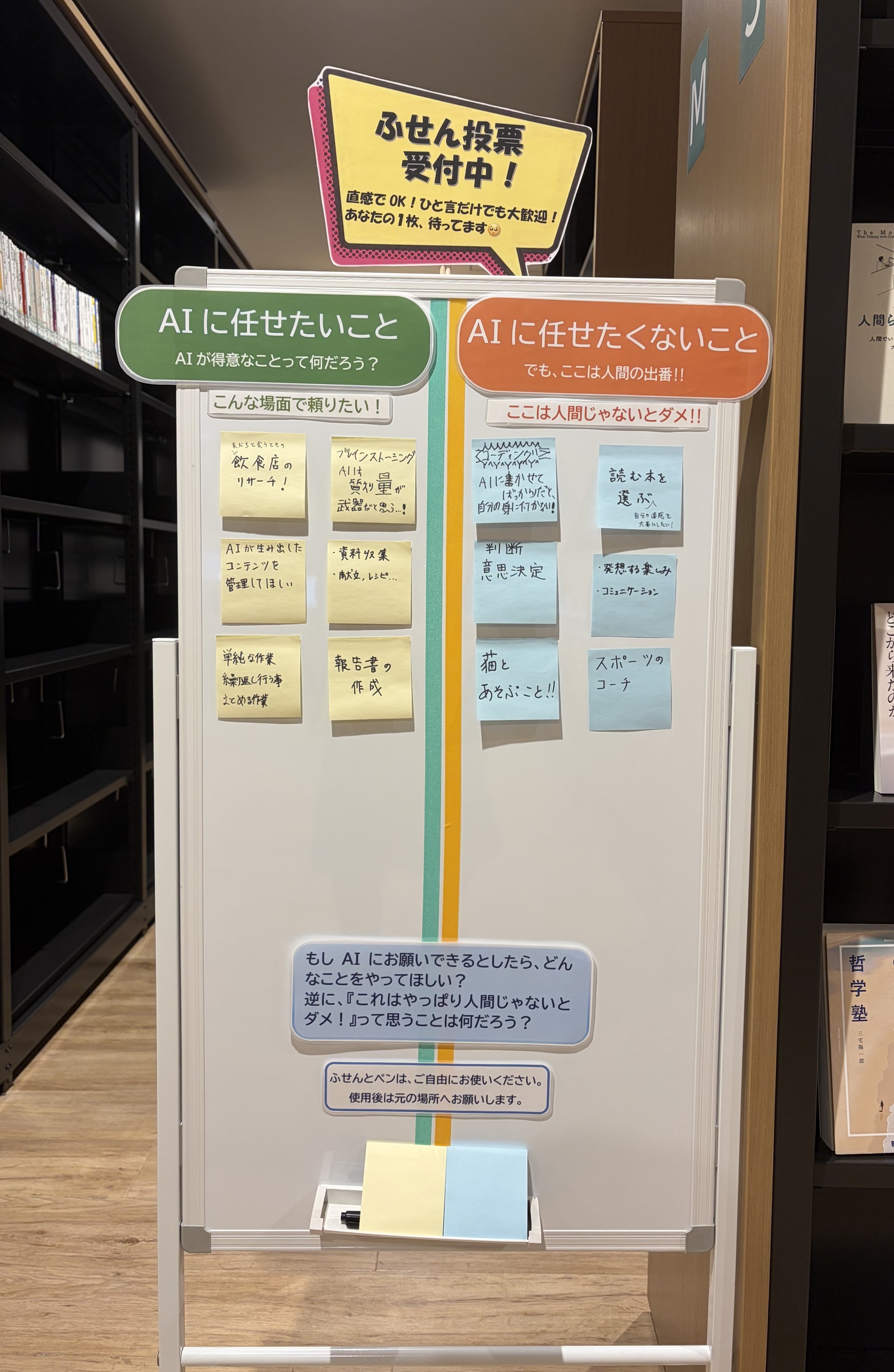 あわせて、参加型企画として 「AIに任せたいこと・任せたくないこと」付箋投票も実施中です! AIに任せたいと思うこと、逆に人間でありたいと思うことを、付箋に一言書いて自由に貼ってください。皆さんの“1枚”、お待ちしています✨